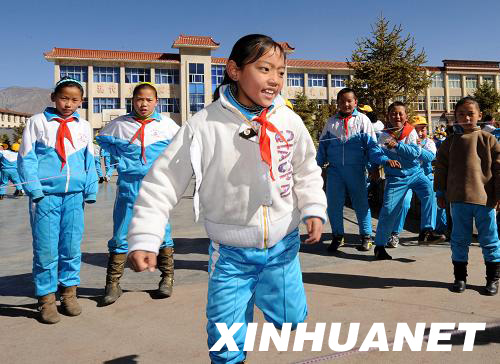 3月9日,拉萨吉崩岗小学学生在课间跳皮筋。新华社