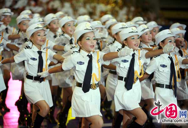 资料图片:8月16日,“迎国庆六十周年,展少年交警风采”为主题的重庆小交警总决赛在大亚湾体育馆火爆上演。经过3个月的层层角逐,决赛团队都很优秀,他们将交警的手势,交通中应该注意的事情都融入到舞蹈之中,精彩纷呈,给观众上演了一场视觉上的饕餮盛宴。
