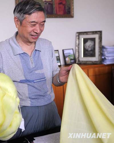 8月27日,中国工程院院士、世界著名蚕学家向仲怀教授在介绍转基因有色丝绸。近年来,他带领西南大学家蚕基因组研究团队率先完成了家蚕基因组“框架图”绘制工作,奠定了我国在家蚕基因组研究中的世界领先地位。
