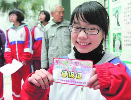 这是树德实验中学西区的新举措 ,全校1000多学生非常投入地参加进去。活动已经进行了2天,昨日仍在继续。一大群刚刚从课堂上“解放”出来的学生,带着乐器在考场外候场;活动现场有6个评委正襟危坐,他们都是学校艺术类的专业老师,每个人面前有红、蓝色的两个牌子,上面分别写着“晋级”、“淘汰”。另外还有计时和统计人员,成功晋级的学生可以在他们面前领取“晋级通行证”。这“大舞台”随便哪个学生都可以上去展示,从前天和昨天的报名来看,有唱歌、武术、评书、小品等,光是乐器类比赛就有琵琶、钢琴、小提琴等等。