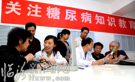 临汾新闻网讯 5月22日,临汾莉轶糖尿病门诊部举办了一场别开生面的糖尿病知识讲座,患者和专家面对面,讲解、提问、探讨等多种形式为一体,使广大患者对如何科学预防和治疗糖尿病有了全面的认识和理解。据了解,该门诊部每月一日都会举行糖尿病方面的知识讲座,并免费为患者测血糖和接受咨询,为大家发放糖尿病防治类书籍。图为当日,临汾莉轶糖尿病门诊部的专家在为患者做测血压、测血糖等检查。 (记者 闫锐鹏 摄影报道)