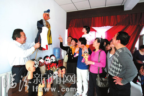 同时,他的作品也为广大的民间艺术爱好者带来了欢乐。 图中李世伟为正在慕名而来的参观者表演皮影戏。