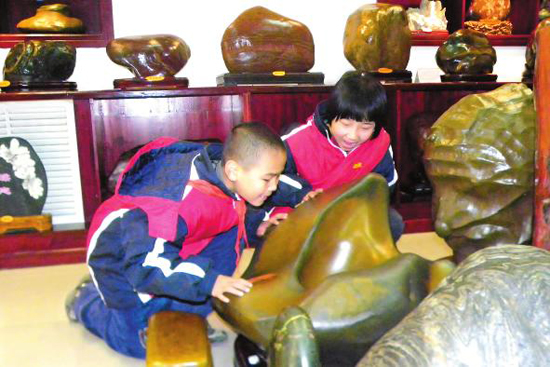 12月12日是个礼拜天,像往常一样,二一三奇石博物馆又迎来一批又一批的孩子,这些孩子都是附近学校的学生。孩子们说,老师推荐我们来这里参观,老师还布置作业了,参观完了要写作文。二一三奇石博物馆的工作人员范秋菊和贺雪一遍一遍不厌其烦地为孩子们解说,这是一块三江彩卵石,产地广西,看上去酷似一张我国的地图;这是一块产地福建的九龙璧石,它的名字叫《都说山西好风光》,他的形状俨然就像我们山西的一张轮廓图;这块产地广西的大化石恰似上海世博会上的中国馆,这是一块两亿年前的硅化木……孩子们充满了好奇,伸出小手摩挲着这些奇异的地球宝贝,祖国广袤的疆土在孩子们的心里扎下了根。