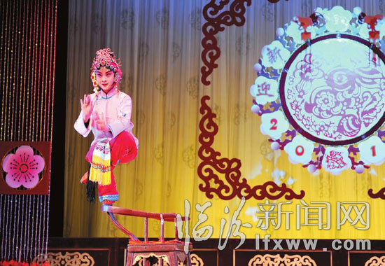 临汾新闻网讯(记者 闫锐鹏) 2010年12月31日,中国戏剧小梅花奖获得者梁静在表演《火凤凰》。当日,我市2011年元旦迎新文艺晚会举行,全市的历届中国戏剧梅花奖获得者轮番登台,为广大戏曲爱好者们献上了一场精彩的演出。