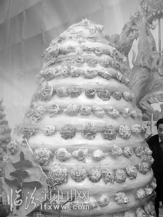 据工作人员介绍,这是他们第一次蒸这么大的花馍,还特意定做了直径为160厘米、高25厘米的铝合金笼屉。20多个人一共蒸了半个月,才蒸好这5个大馍。这些花馍没有添加任何防腐剂,为了防止表面干裂,他们使用了保鲜膜。