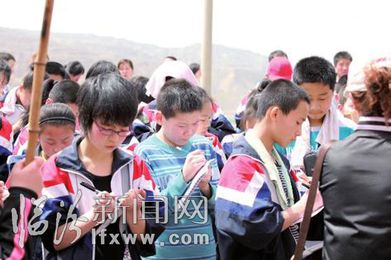 不到5小时他们徒步行走17公里,来到了尧都区大阳镇上阳村。在这里,他们按原计划一起就餐——津津有味地吃馒头就咸菜,认真听记镇领导讲解上阳村的新农村建设,在清理休息场所的卫生时,大家表现得非常踊跃。然而,再次行走时问题出来了,有一部分同学明显感到体力不支,脸色或变青或变白;过了涝河水库大坝以后,连佳舜似乎也达到了体能极限。当李校长按照活动预案准备用车拉体质弱的学生时,学生们却表现的十分坚定:“我们很累,但我们要走完全程!”连佳舜也深受感染,虽然几次都感到坚持不住了,老师也上前扶住他,但他还是大声说道:“我能行!”