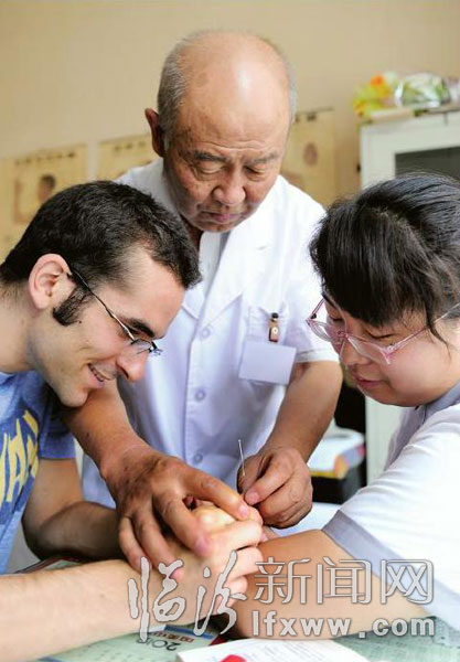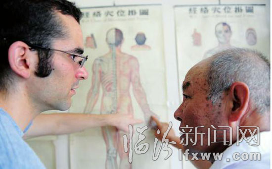 杜春青中医在为洋徒弟倪百安讲解人体穴位与经络。