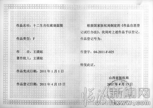 连王英铭自己也没有想到,问世后的“十二生肖收藏扇面图”于2011年4月13日经山西省版权局审核注册,紧接着,吉县壶口旅游开发有限公司向“十二生肖收藏扇面图”伸出了橄榄枝,签订了年产10万幅的十二生肖壶口旅游扇项目。