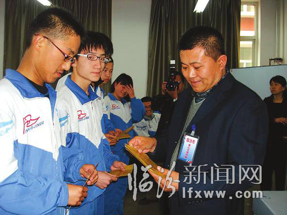 在学生们的阵阵掌声中,现场观摩书画活动告一段落,“临汾一中2012——2013年度优秀学生奖学金暨临汾市爱心书画协会优秀学生奖学金”颁奖仪式拉开帷幕。临汾市爱心书画协会会长关大庆,为35位优秀学生送上饱含爱心与温暖的奖学金,鼓励他们“好好学习,回报社会”。获奖学生难掩兴奋:这不仅仅是物质上的奖励,更是精神上的鼓舞。我们会加倍努力学习,以优异的成绩答谢社会上的爱心人士。”