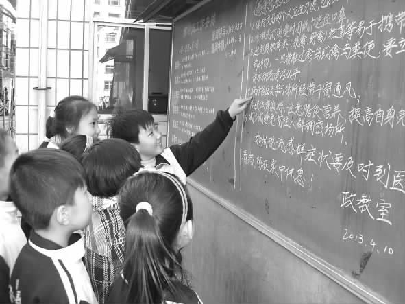 “保持良好的个人卫生习惯,经常用肥皂和流水洗手;咳嗽或打喷嚏时用纸巾遮住口鼻……”4月10日,针对近期突发的H7N9禽流感疫情,临汾时代风华特色学校利用校园通知栏、主题班会等形式,对学生进行H7N9禽流感的防护常识教育。