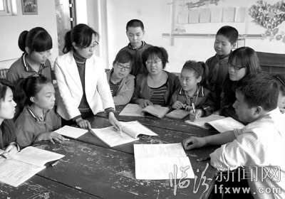 校领导就学习方法接受孩子们的咨询。中)为校长李敏。