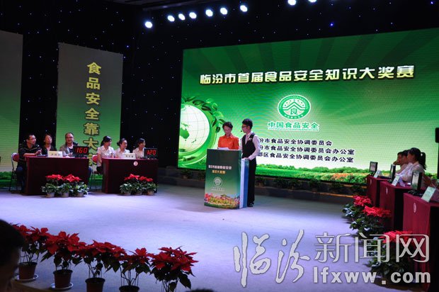 临汾新闻网讯(本网通讯员 张伟 董栋)5月9日,在临汾电视台的演播大厅,临汾市、尧都区两级食安协委办联合举办了“临汾市首届食品安全知识竞赛”。 临汾市17个县市区,临汾、侯马开发区,市质监局、食药监局、工商局、畜牧兽医局、商务局共计24支代表队120人参加了比赛。市人大副主任王金珍,省政协委员、临汾市政协副主席杨益民,市食安协委办主任、市卫生局局长王山等有关领导出席了比赛活动。并为获得一、二、三等奖和优秀奖的参赛队伍进行了颁奖。此次食品安全知识竞赛将在临汾市电视台黄金时段进行滚动播出。