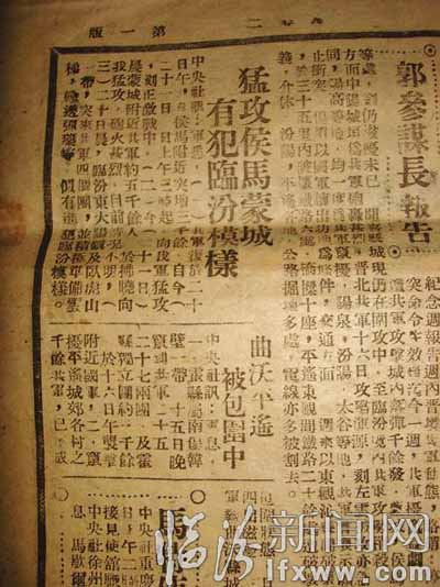 摊开这泛黄的老报纸,猛攻侯马蒙城,有犯临汾模样》、曲沃平遥,被包围中》等两则标题映入眼帘。细细读来,当时的战役状况一一展现:中国人民解放军在1月20日,于侯马附近突增三千余人,自21日上午向国民党军猛攻,一时激战。同一天,蒙城县附近也发生了激烈的战争。另外,临汾东大阳镇及卧虎山一带,突来中国人民解放军的四个团,继续准备云梯,输送弹药,准备进军临汾。而另一则叙述了曲沃及平遥已形成中国人民解放军的包围圈。