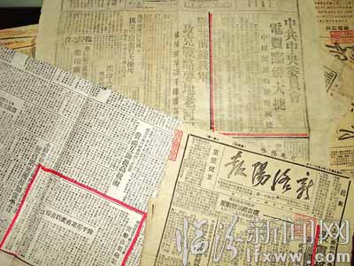 “这些年,我经常往返于北京、太原、运城的旧货市场和古玩城,只要听说哪里有老报纸,我就尽快赶过去。而且我收藏的老报纸有个特点,都是1948年出版的,必须含有临汾解放的信息。”赵鹏介绍,过去的老报纸时效性不如现在强,有的几天一期,有的甚至半个月一期,所以我收藏的报纸刊 发日期多在5月20日或之后。”随后,赵鹏小心翼翼地将一份份保存尚好的老报纸平铺在桌上。翻开《新民日报》《商报》《大众日报》《东北日报》《新洛阳报》等,可以看到赵鹏特意用红笔勾出的标题和文章,中共中央委员会,电贺临汾大捷》《中共华北中央局,电贺临汾胜利》《我军攻克临汾,歼灭国民党阎匪十三个团》等再现了战争的硝烟和解放的喜悦。