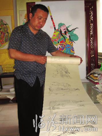 为了更好地展示平阳木版年画身后的文化底蕴,赵国琦为本届文博会新近创作了《关公像》、《三晋名人图》和《四美图》套系。“《关公像》直接取材于刺绣,也算是一种创新。”赵国琦介绍说,更为纤细的线条,在使画面更加细腻的同时,也提高了艺术表现力,使关公更加威武、逼真。《三晋名人图》是他根据山西古今名人创作的一副85米长的卷轴,上面有女娲、尧、舜、禹等山西名人图像,他希望能够通过这幅卷轴展现山西灿烂辉煌的历史和临汾厚重的历史文化。