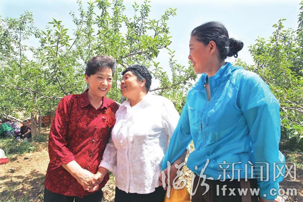 韩雅琴(中)与演员王馥荔(左)等在一起亲切交谈。李秀荣/图