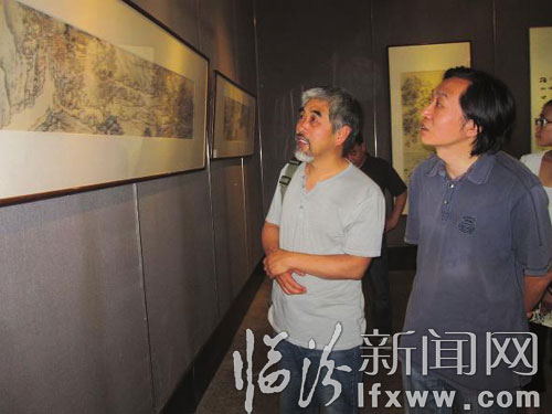 山西师范大学美术学院院长李晓庵与山西师大书画所所长、著名画家赵亭人观赏李卡作品。
