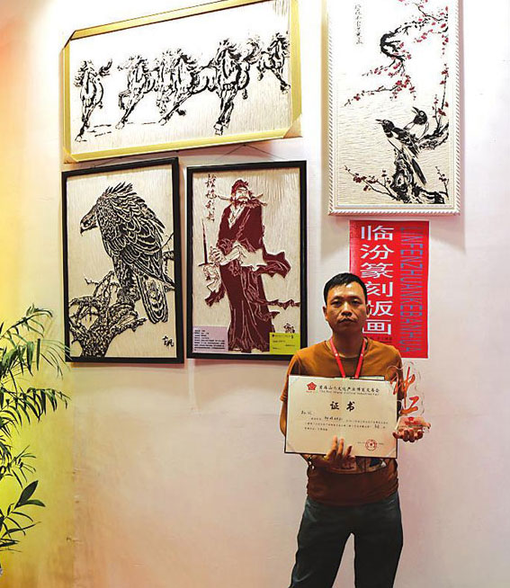 孔斌说,由于他的作品独一无二,在文博会展览期间得到了不少人的好评,不少人纷纷来到他的作品前参观并拍照留影。让他感到意外的是,在展览期间,还有好多人对他的作品不仅表示出认可,还咨询价格希望购买。首次在大型场合公开展览,孔斌的作品不仅获得游客的好评,而且还获得主办方的认可,他的篆刻版画作品《钟馗利剑》还获得“山西文化产业博览交易会神工杯美术精品奖”铜奖,这着实让孔斌有点喜出望外。