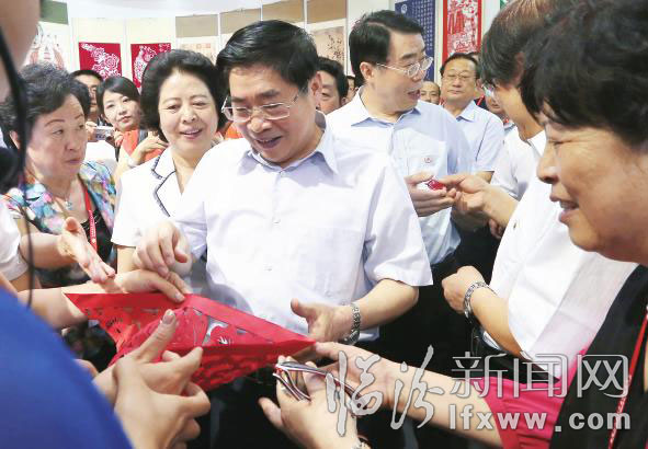 省委书记袁纯清,省委常委、宣传部部长胡苏平在临汾展厅观看艺术剪纸。