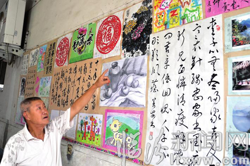 老人向大家介绍小区板报栏里自己和孩子们创作的书画作品。