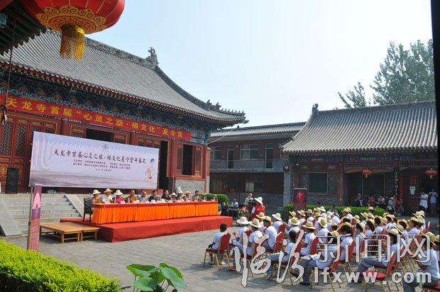 由我市佛协主办、天龙寺承办的首届“心灵之旅·禅文化”夏令营是8月15日拉开帷幕的,本届夏令营以“觉悟人生、奉献人生”为主题,活动为期7天,通过聆听专家们对传统文化的讲解、学习中华礼仪、研习书法、学习茶艺、欣赏佛乐、在互相交流中打开心结,达到化解社会矛盾、平衡心理状态、树立生活目标、找到人生价值、创造美好未来的目的。作为夏令营的开篇,当日活动进行井然有序,如期完成。