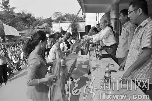 在庆祝教师节的大会上,杨振业院长为该校优秀教师颁发了证书,表扬和鼓励了他们的辛勤劳动,并且给每个年级的优秀学生发放了奖金,并和学生们亲切交谈,激励他们努力学习。