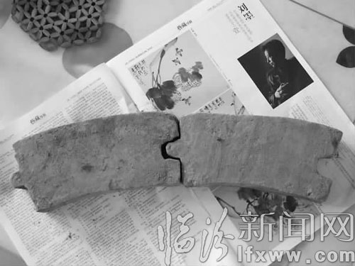 记者看到,赵延武师傅捡到的青砖有两块,青砖上沾满黄土,两块青砖大小相等,均呈不规则的扇形,经测量,青砖长21厘米,宽11厘米,厚4.5厘米。青砖一侧的正中间有半圆形的凸出,另一侧的正中间则是凹进去的半圆形,凸出与凹进去的部分大小相同。两块青砖放在一起,凸出与凹进去的部分可以互补,如同一个整体,形成了一个更大的弧形。