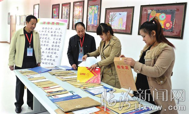 评委们和评审监督员正在认真评选参赛作品。记者 闫锐鹏 摄