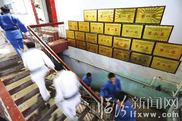 通往市柔道队训练馆的楼道里,挂着各种荣誉奖牌,这是历年来在大赛中取得的荣誉。在临汾市竞技体育发展上,我市柔道队成绩可谓出尽风头,队员们不仅在省运会上连夺佳绩,在全国比赛中也勇夺冠军,在所参加的世界级赛事中也取得骄人成绩,为临汾体育争得不少荣誉。为了能将临汾竞技体育发展强大,我市柔道队继续“顽强拼搏勇攀高峰”,队员们坚信“只有付出超人代价,才能取得超人的成绩”。