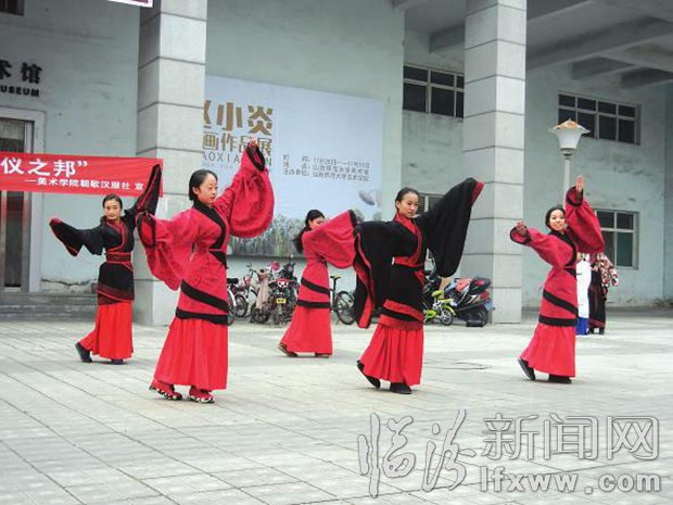 临汾新闻网讯 (记者 李静 实习生 杨杰) 12月6日,伴着曲调悠扬的《相和歌》,20多名身着汉服的大学生在山西师范大学美术馆广场翩翩起舞,让观者有种穿越之感。