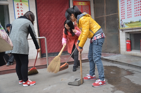 在敬老院里,学生们帮老人打扫卫生,把院子里的护栏、窗台擦得明亮,地上的赃物清理干净之后,走进老人们的宿舍,陪他们聊天,了解关心他们的日常生活。