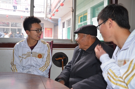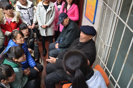 89岁的杨连庆老人身体依旧硬朗,坐在院子的长椅上晒太阳。“爷爷,您还记得我吗?”地理科学院学生王雪来到老人的身边蹲下身子问道。“记得,你就是上次来的那个小姑娘。”老人顿时喜笑颜开,喜欢热闹的他给孩子们唱起了“东方红,太阳升...”