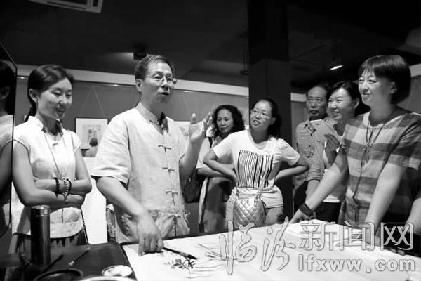 临汾新闻网讯 6月9日,著名漫画家李二保在侯马市晋国古都博物馆为大家传授水墨漫画创作经验。其幽默风趣、深入浅出的讲解,让广大漫画爱好者受益匪浅。当日,中国水墨漫画精品展暨李二保水墨漫画展在侯马市晋国古都博物馆开展。 张跟慧 摄