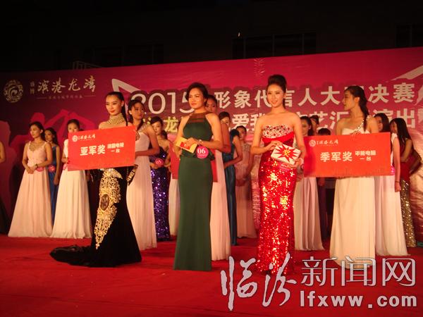 最后,6号选手李艳超夺得本届赛事冠军,17号选手王佳喜获亚军,季军则由23号选手王慧欣夺得,盛博房地产公司领导给本届大赛前三名的选手颁发聘书及奖品,并且大赛冠军被聘请为“滨港龙湾”社区的2015年度形象代言人,她将作为“滨港龙湾”社区的品牌形象代表出席后续的相关公众活动,聘期为一年。(秦芳媛)