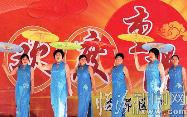图③:尧都区老年大学霞光艺术团和尧都区中心敬老院举办的联欢庆重阳活动上,老年模特在表演《烟花三月下扬州》。