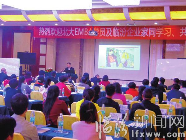 临汾新闻网讯 10月17日至18日,北京大学商界领袖EMBA课程临汾站活动在唐尧大酒店举办。中国质量万里行名牌战略部部长、副秘书长、中国新品牌联盟主席万力和来自临汾以及周边地区的数百名中小企业精英人士齐聚一堂,就“品牌战略”、关注中小企业发展问题,进行了深入探讨学习,整个教学深入浅出、生动活泼。据了解,该活动是由北京大学民营经济学院、北京燕园商学教育主办,山西博虎文化艺术有限公司协办。图为活动现场。