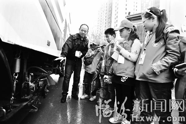 临汾新闻网讯 10月24日,临汾日报晚报版组织30余名小记者走进市环卫局北城环卫所举办了“我是小小环卫工、爱护卫生我先行”活动。活动中,小记者们参观了环卫清扫车,聆听了临汾环境变化,并向环卫所工作人员学习了爱护环境卫生小常识。 记者 魏华 摄