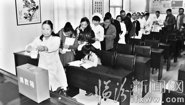 临汾新闻网讯 近日,临汾市妇幼保健院儿童医院组织全院职工,为对口扶贫村蒲县乔家湾乡前进村贫困家庭募捐善款。近年来,蒲县乔家湾乡前进村作为妇幼保健院定点帮扶贫困村,多次得到妇幼院帮助,他们积极为村里办一些看得见、摸得着的实事好事,关注村民生活状况,促进村里早日脱贫致富。图为捐款现场。