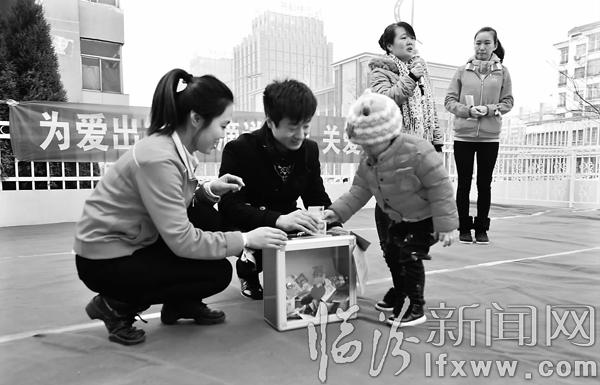 临汾新闻网讯 12月11日,临汾向阳西路红黄蓝国际双语幼儿园组织了“为爱出发点滴送真情关爱孔菲”活动,号召全园教职工和幼儿家长共200余人为霍州患白血病女孩孔菲捐款,为他们送去了爱心。图为捐款现场。记者 李自强 郑远飞 摄