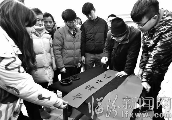 临汾新闻网讯 2015年12月28日,山西师范大学书法学院在校园西侧通道上开展“迎新年送春联”主题活动,当日共送出300余幅春联,赢得了过往师生的称赞。 孙国芳摄