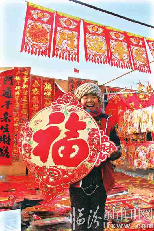 临汾新闻网讯 2月1日,在市区平阳广场,购买对联的市民络绎不绝,一派浓浓的年味。正在放寒假的三年级女孩妞妞利用课余时间,帮妈妈卖春联,她拿着一个“福”字高兴地举起来向大家展示。 记者 王婧 摄
