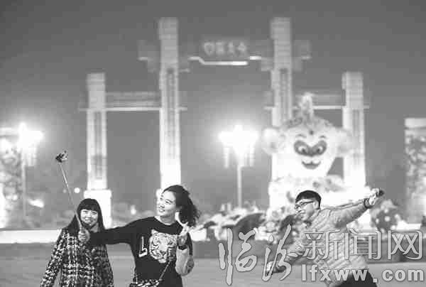 临汾新闻网讯 2月21日晚(农历正月十四),3位年轻人在临汾市汾河公园九州广场灯展上留影,灯展吸引了大量市民,人们走出家门赏花灯喜迎元宵佳节。
