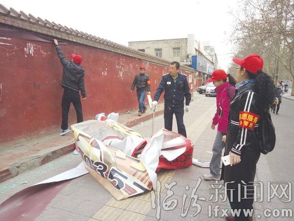 当天上午,志愿者分为两队,分别前往贡院街、平阳南街小商贩经常扎堆摆摊的路段,向临街的单位、门店进行宣传,并协助市容管理队员拆除临街两侧乱设的二级管灯箱和广告牌,清除临街店外堆放的商品、杂物等。