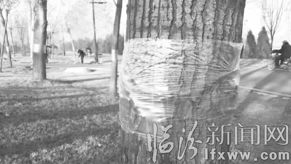 临汾新闻网讯 春天来了,万物复苏,然而许多危害植物的害虫也“破土而出”。3月28日,记者在汾河公园看到,园林工人正在给绿植的树干上缠绕保鲜膜防止害虫的侵扰。