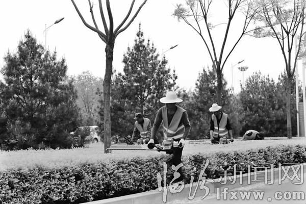 临汾新闻网讯 4月19日,在市区滨河西路,市园林局的工人师傅们正在对马路两旁绿化带的苗木进行修整,美化市容环境。