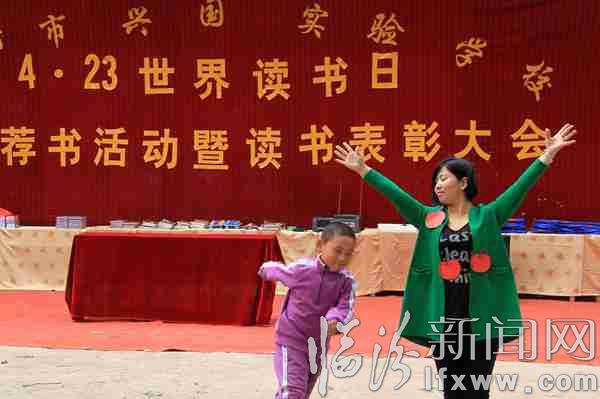 临汾新闻网讯 4月23日,在我市兴国实验学校小学部,老师在和学生做互动游戏。当日是世界读书日,该学校举办了主题为“阅读提升校园品位,求知丰富精彩人生”读书活动,通过诵读弟子规、情景剧以及读书会等活动,培养学生爱读书、读好书的良好习惯。