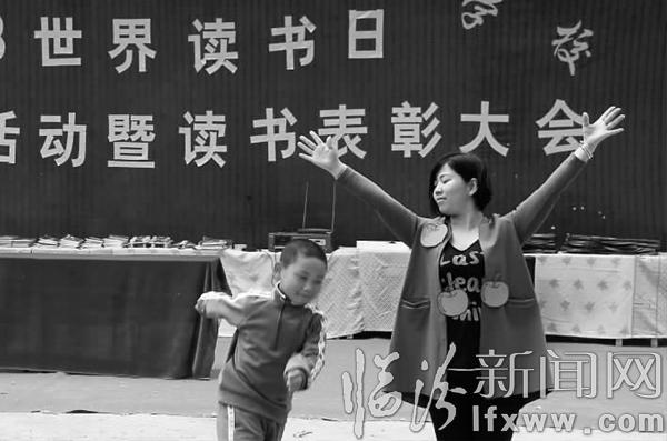 临汾新闻网讯 4月23日,在我市兴国实验学校小学部,老师在和学生做互动游戏。当日是世界读书日,该校举办了主题为“阅读提升校园品位,求知丰富精彩人生”读书活动,通过诵读弟子规、演情景剧以及读书会等活动,培养学生爱读书、读好书的良好习惯。