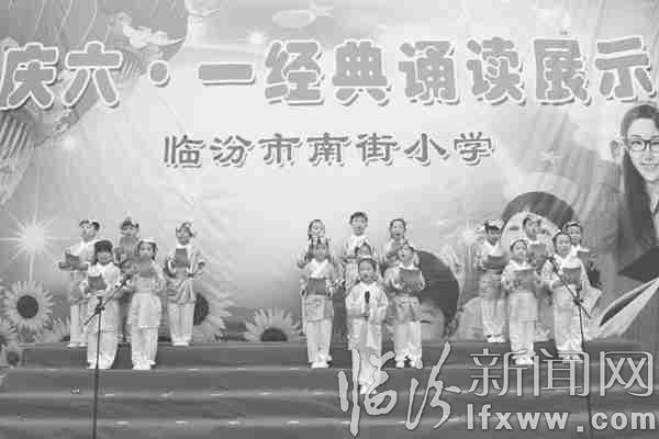 临汾新闻网讯 5月18日,临汾市南街小学举办了“庆六·一经典诵读展示”活动。师生们在诵读、吟唱、表演经典过程中,充分领略到了中国优秀传统文化的灿烂与魅力。同时,该活动也为校园文化生活注入了激情、增添了活力,深受广大师生和家长们的欢迎。图为一(9)班学生正在朗诵《少年中国说》。