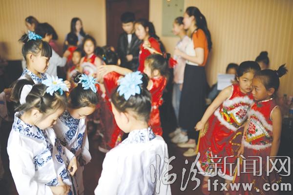 “集合,集合!马上该我们上场了,听老师的口令,深呼吸,全身放松,两人一组,开始伸展运动……”在后台的排练室内,即将登场表演舞蹈《青花瓷》的一群孩子们,身着一席幽兰雅致的服装,在老师的指导下,进入了倒计时的“冲刺状态”。