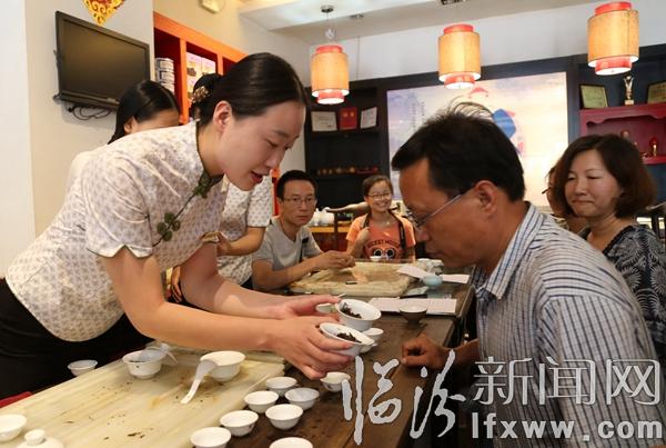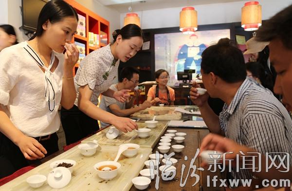 临汾新闻网讯 6月25日,在我市日春茶业,工作人员在为茶艺爱好者讲解茶叶的品质。当日,日春茶业举办的主题为“夏日品茗,茶王争艳”茶王赛吸引了我市茶艺爱好者前来品茶,活动现场,主办方通过红茶、绿茶、乌龙茶以及普洱茶等茶系的现场泡茶、品茶、鉴茶等环节,搭建一个分享学习平台,让更多的市民和爱茶之人,了解高质量的好茶,掌握辨别茶叶品质的知识,传播传统文化知识,促进我市茶文化的健康和谐发展。 记者 闫锐鹏 摄